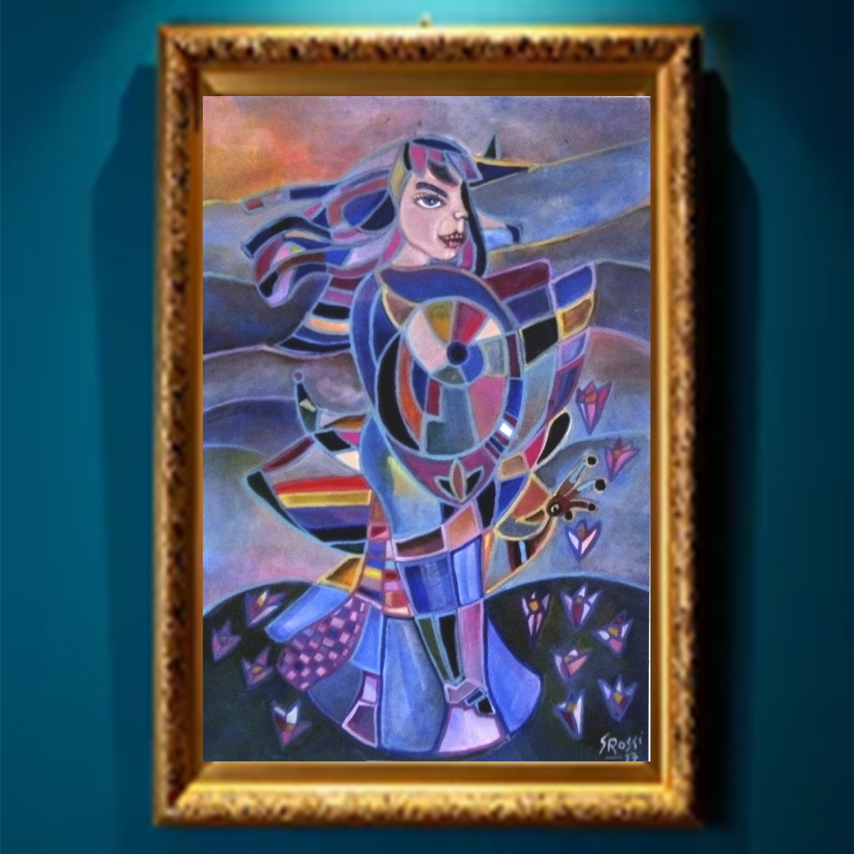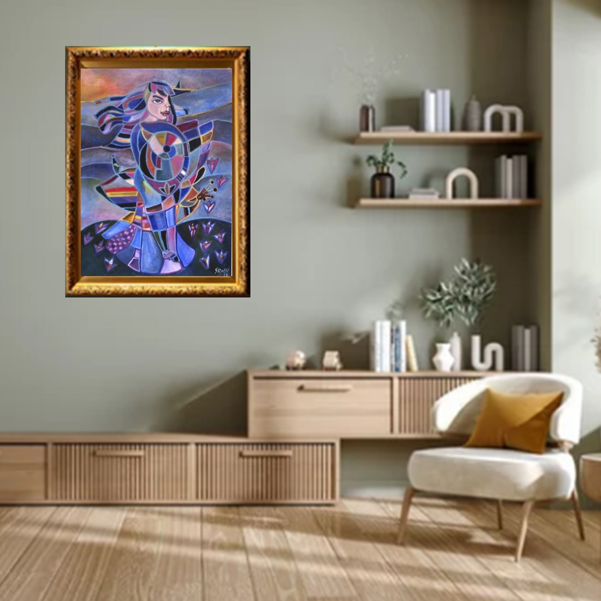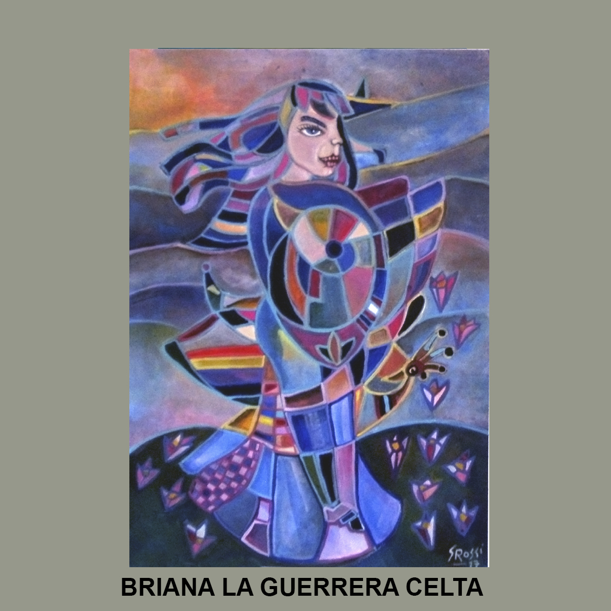 Inspirada en el realismo mágico y la tradición ancestral, esta pieza la retrata de espaldas, mirando el horizonte de las próximas batallas, con un escudo en sus manos y las montañas como trasfondo.Con una composición colorida y planos fragmentados, la obra ofrece una propuesta única para decorar y reflexionar sobre las batallas de la vida, simbolizando la justicia y la fuerza de una mujer independiente que se enfrenta al destino con coraje. Aunque no existe un personaje mitológico exacto llamado “Briana la guerrera”, el nombre y su espíritu combativo resuenan con figuras históricas y divinas del mundo celta. Briana se convierte en un símbolo moderno que recoge la herencia de mujeres poderosas como Boudica, la reina icena que desafió al Imperio Romano, y Brigid, la diosa triple asociada al fuego, la poesía y la sanación. Ambas representan la fuerza, la resistencia y la conexión espiritual que caracterizan a las culturas celtas.
